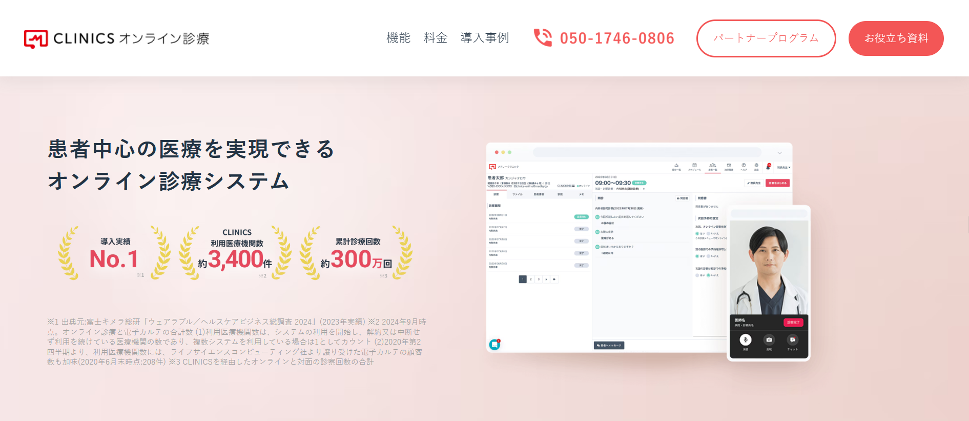 CLINICSは、診療所の業務全体を効率化する多彩な機能と、手厚いサポート体制が魅力のプラットフォームです。オンライン診療の導入を包括的に進め、業務をデジタル化したい医療機関に向いています。