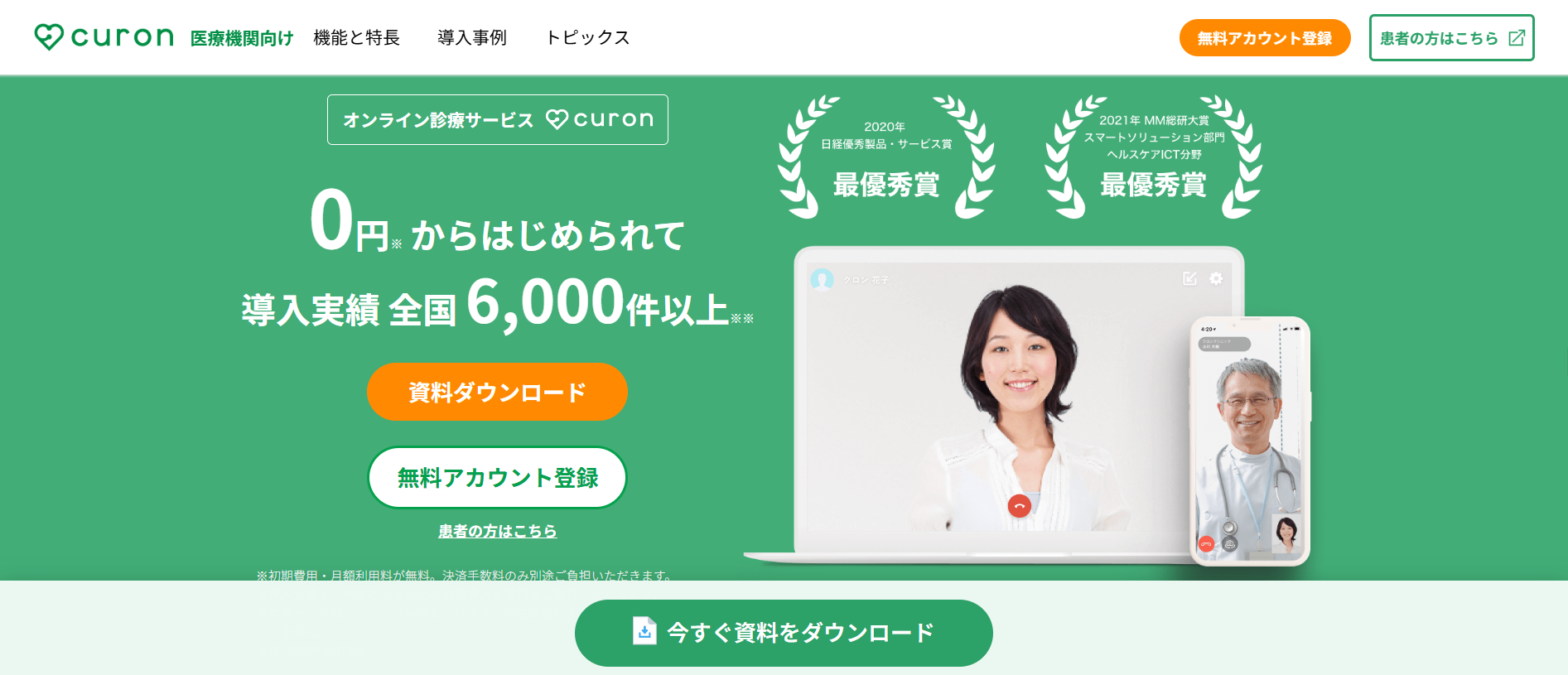 curonは、シンプルな機能性と導入の手軽さが特徴のサービスです。全国6,000件以上の医療機関で導入されています。