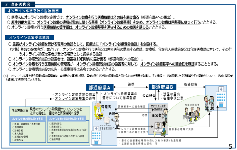 現在、オンライン診療の実施にあたり遵守すべき事項は「オンライン診療の適切な実施に関する指針」に定められています。また、医師が常駐しないオンライン診療のための診療所の開設にあたり求められる基準は、「特例的に医師が常駐しないオンライン診療のための診療所の開設について」に記載されています。