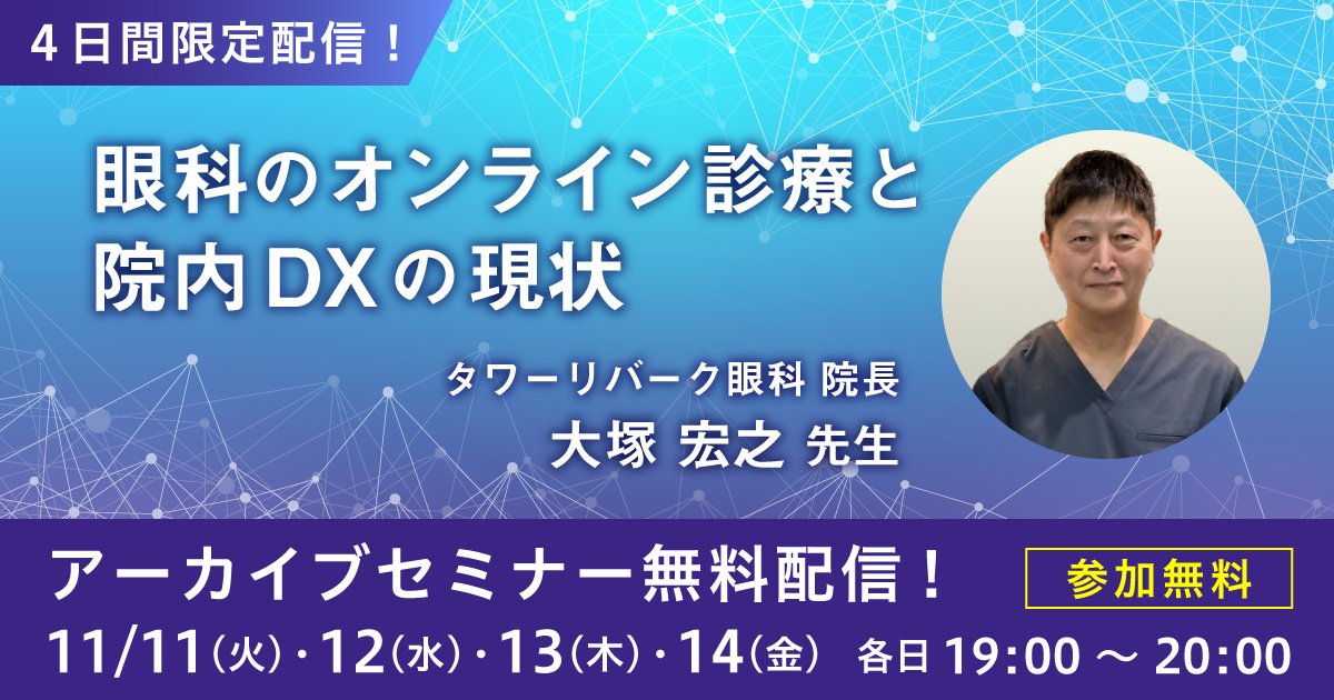 眼科を例に、オンライン診療の取り組みやクリニック内での医療DXをどのように進めてきたのか、オンライン診療黎明期より積極的に医療のオンライン化に取り組んできたタワーリバーク眼科の大塚宏之先生に解説いただきます。
