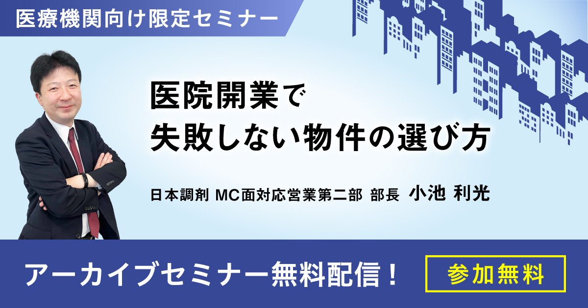 開催日 2025年12月18日(木)・19日(金)・20日(土)・21日(日) 本セミナーでは、医院開業や移転の際に知っておきたい「集患できない物件」10パターンと「医療DX」の核となるテーマのオンライン診療の導入について解説いたします。