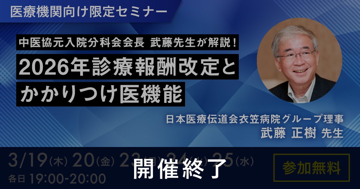 開催日 2026年3月19日(木)・20日(金)・23日(月)・24日(火)・25日(水) 本セミナーでは、中医協入院医療等の調査評価分科会 元会長として、長きにわたり政策に携わってこられた武藤 正樹 先生をお招きし、2026年診療報酬改定とかかりつけ医機能について解説していただきます。
