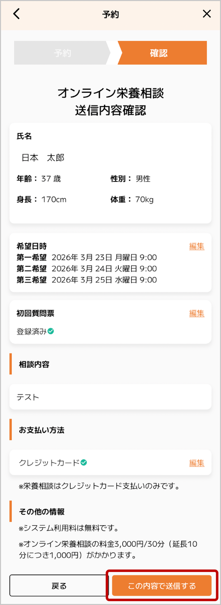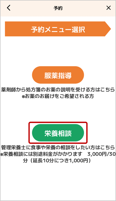 ご利用の際は予約画面にて「栄養相談」を選択のうえご予約ください。