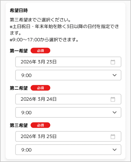 ※土日祝日・年末年始を除く3日後以降の日程をご指定下さい。