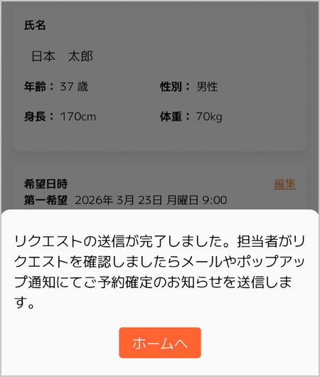 予約リクエストフォーム送信が完了します。