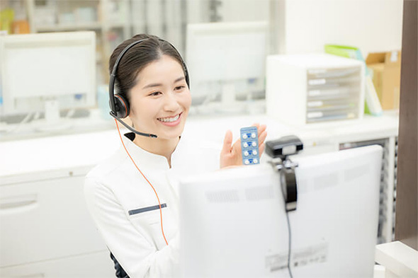 オンライン服薬指導とは、スマートフォンやパソコンなどの ビデオ通話機能を利用して、患者さまは自宅にいながら薬剤師 から処方薬の飲み方の説明を受けられ、外出することなくお薬を受け取ることもできるサービスです。